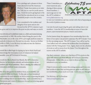 The final commitment made by the APTA Board under Tim’s leadership was a commitment to a computer based APTA interclub league system that will allow APTA member leagues to schedule, track results and share information free of charge, compliments of the APTA. This interclub interface system was committed to in the Spring of 2012.