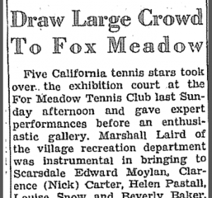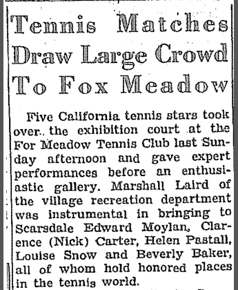 The Village recreational department was instrumental in bringing Edward Moylan, Clarence Carter, Helen Pastall, Louise Snow and Beverly Baker, all of whom held honored places in the tennis world, to the club.