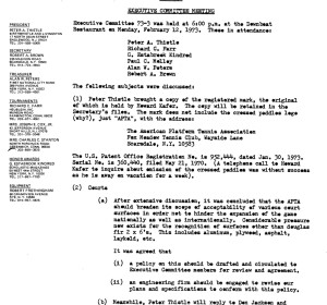 The plywood surface was developed by “Mr. Paddle”, the Hall of Fame Inductee Dick Squires’ company Squires Marketing Associates Company (SMAC). The Minutes note that the APTA expected SMAC to seek approval soon but there had been some issues reported; ultimately the plywood deck proved unworkable. The surface had been used at the VAT Gold Cup earlier in the year.