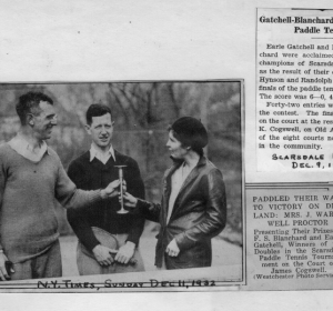 By December, there were eight platforms in Scarsdale alone and the first open tournament took place, with forty-two entries. The new, larger Cogswell platform and court were the venue for the finals. Earle Gatchell and Fessenden Blanchard, representing the Old Army Athletes, won an exciting final match, 6-0, 4-6, 6-2, from Randolph Compton and James N. Hynson. “Paddled their way to victory on dry land,” said The New York Times.