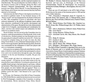 In two separate presentations, the APTA Hall of Fame was increased by four honorees. The first ceremony was held at the Fox Meadow Tennis Club on February 28, at the time of the Men’s Senior Nationals, and the surprised recipient was Chet Kermode.