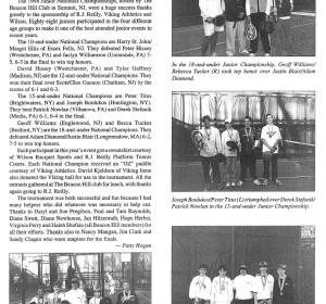 The 1998 Junior Nationals Championships, hosted by The Beacon Hill Club in Summit, NJ, were a huge success thanks greatly to the sponsorship of R.J. Reilly, Viking Athletics, and Wilson.