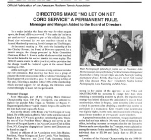 In a major decision that led the way for other racquet sports, the Board of Directors voted 17-3 to make the “no let on net cord service” a permanent part of the official rules. The vote had been taken following a random poll of 10% of the membership that showed support for the change.