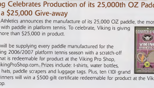 Viking will be supplying every paddle manufactured for the upcoming 2006/2007 platform tennis season with a scratch-off ticket that is redeemable for product at the Viking Pro Shop.