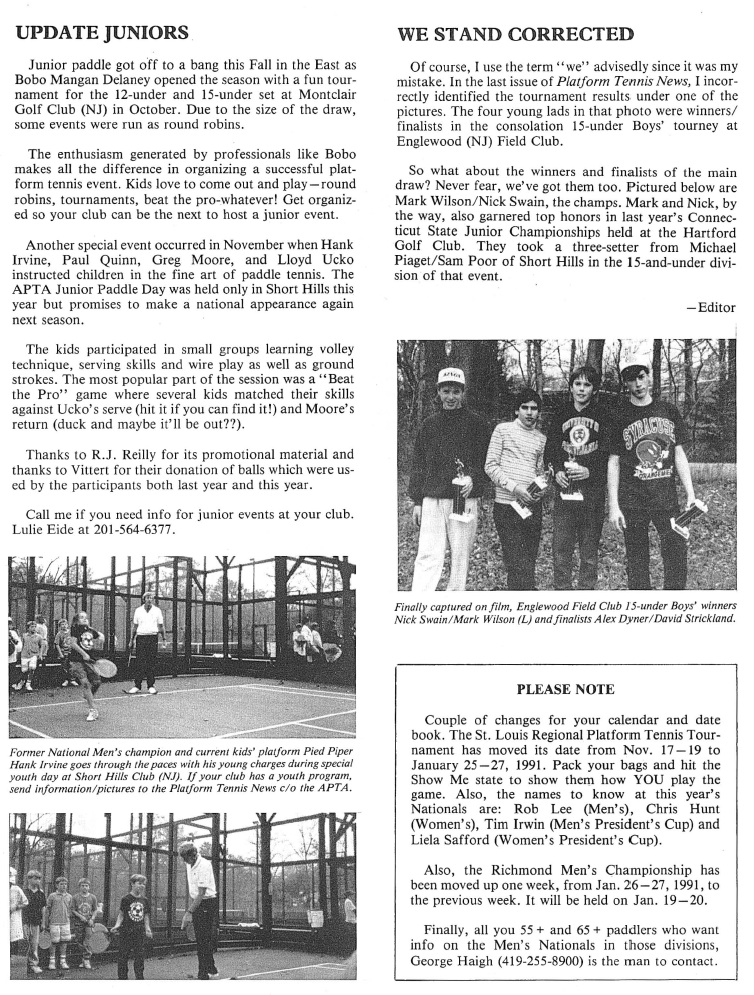 Platform Tennis News reported on a 12 & under and 15 & under tournament run by Bobo Delaney at Montclair Golf Club, as well as a Junior clinic at Short Hills featuring Hank Irvine, Paul Quinn, Greg Moore, and Lloyd Ucko.
