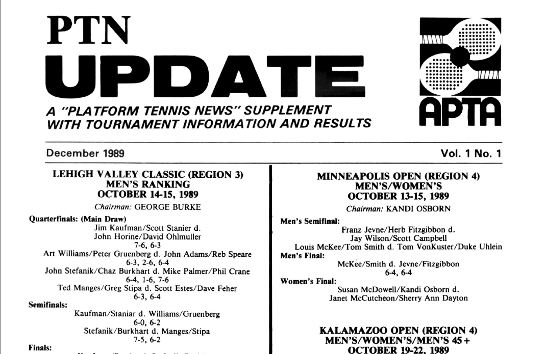 “It has been conceived but it is not yet born. If it survives, it will be named ‘PTN UPDATE.’ Like so many publications similarly designated, its mission is to bring current news to everyone while it is still, well, current. In our situation, the principal news will be the results of tournaments around the nation, any schedule changes, and information on competition in various leagues. ‘PTN UPDATE’ will take the shape of a “newsletter’ while Platform Tennis News will move more towards being a ‘magazine.’ It is expected that the new publication will be four letter-size pages in length, with one page being reserved for addressing and advertising.
