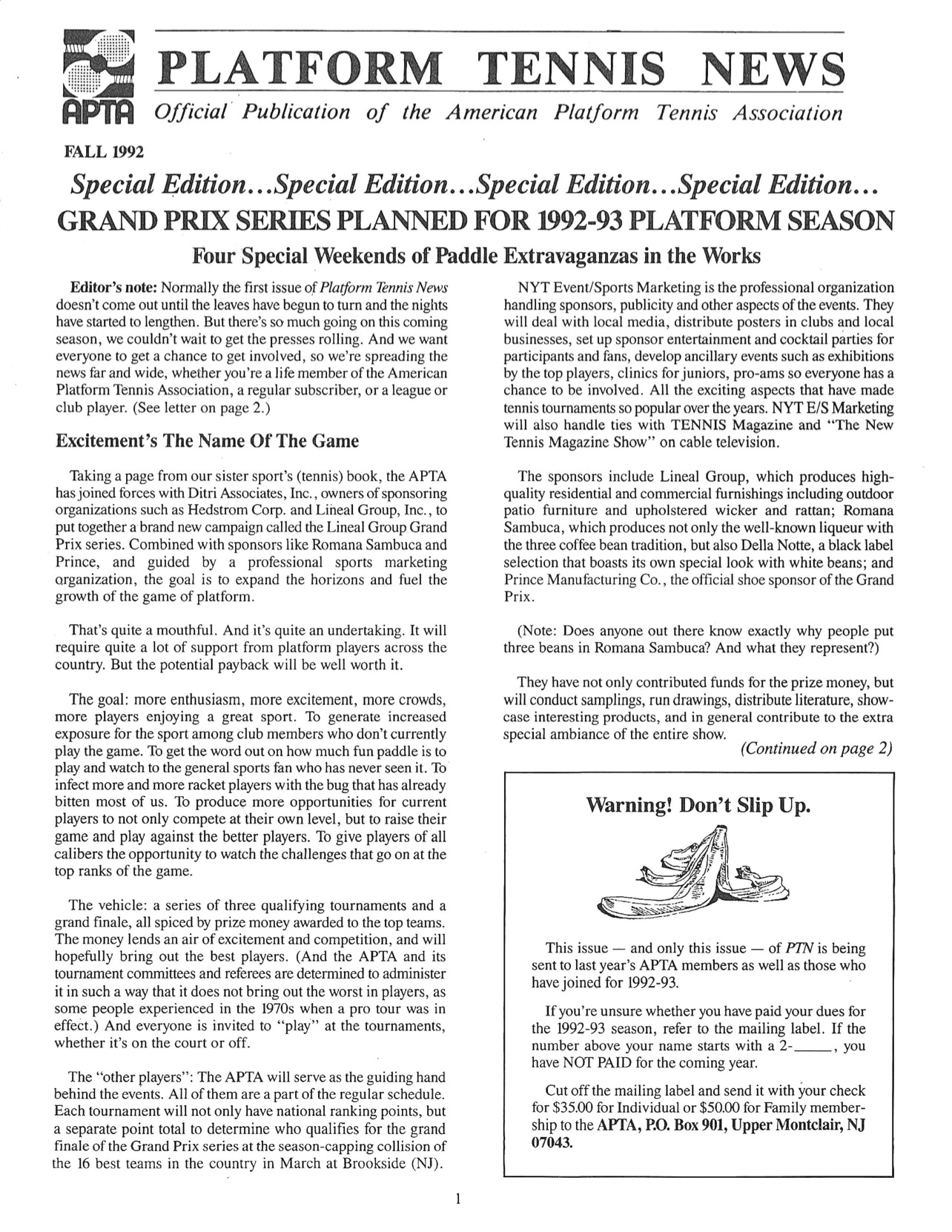 “Combined with sponsors like Romana Sambuca and Prince, and guided by a professional sports marketing organization, the goal is to expand the horizons and fuel the growth of the game of platform. That's quite a mouthful. And it's quite an undertaking. It will require quite a lot of support from platform players across the country. But the potential payback will be well worth it. The goal: more enthusiasm, more excitement, more crowds, more players enjoying a great sport.