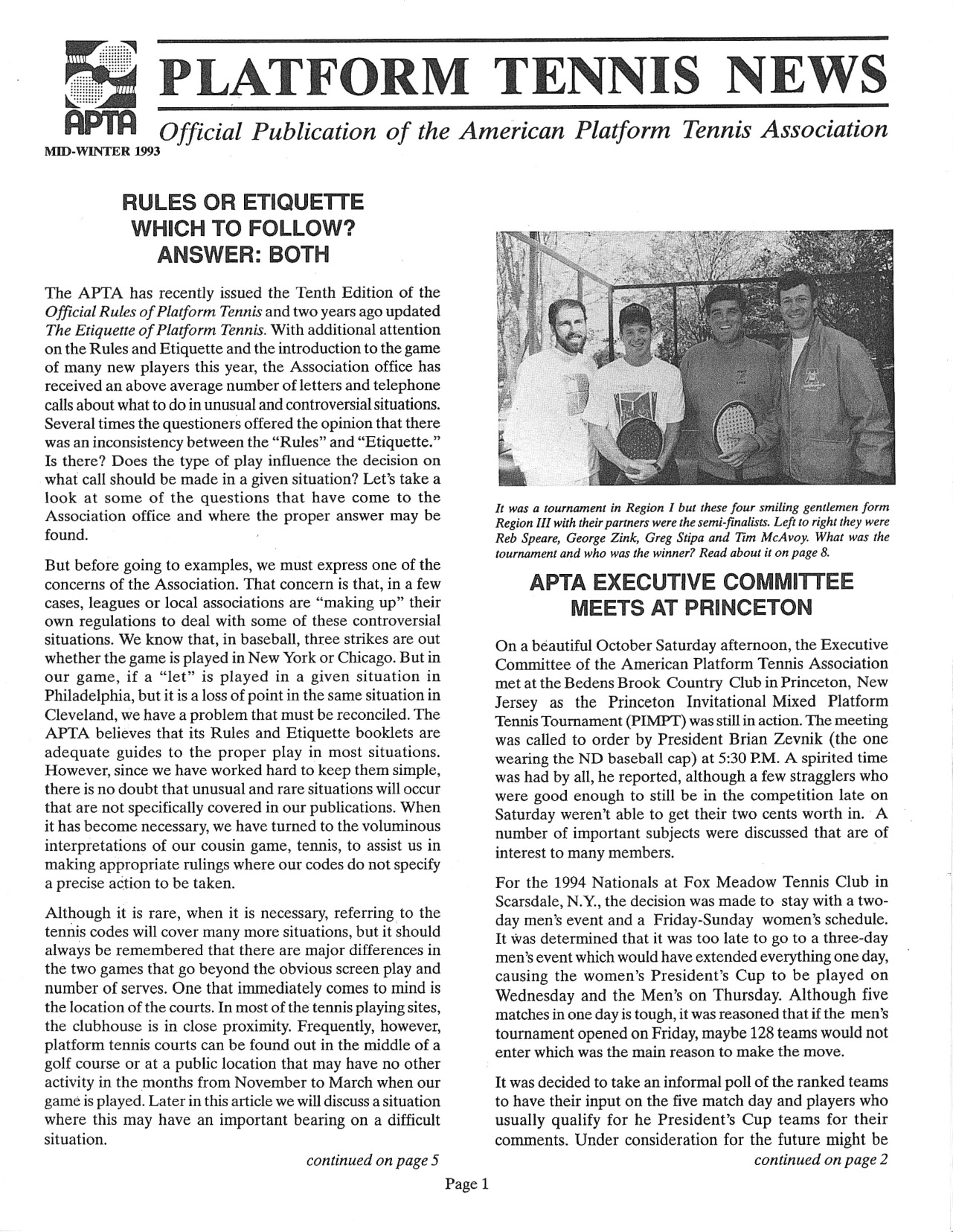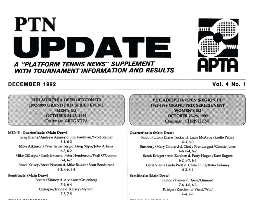 The Men's and Women's Nationals were covered in PTN Spring 1993: “It was the toughest one of them all to run,” admitted APTA Nationals chairman Walt Peckinpaugh afterward. "But with the money we raised for charity, and overcoming the bad weather, and putting on the Saturday night show ... well we didn't do too badly, I guess." Almost a foot of snow fell during the tourney, along with hail, sleet, rain and more. Robin Fulton/Diane Tucker solidified their claim as numero uno in the women's ranks with a rollercoaster three-set win over Patti Hogan and Kate Rogers. But on the men's side, Bill Fiedler and Barry Judge took the men's title by knocking off both top seeds in thrilling three-set matches. Source: Platform Tennis News, Spring and Fall 1993