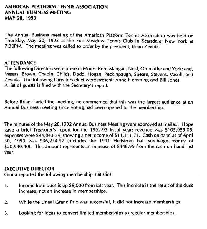 The new edition was more than a reprint of existing text. With input from all the directors of the Association, and suggestions from members, Rules Committee, Director Bob Brown did a major rewriting of the text. One of the seemingly simple, but really arduous tasks was to remove all the male pronouns (he, his, him) from the rules, in line with current practice. The second major effort was to clarify rules for certain play situations that were not specified, but were understood to be accepted practice in actual court action. For example, the circumstances surrounding the ball hitting a net post were defined much more clearly than in the prior edition of the Official Rules. Source: Platform Tennis News, Summer 1993