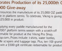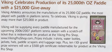 Viking will be supplying every paddle manufactured for the upcoming 2006/2007 platform tennis season with a scratch-off ticket that is redeemable for product at the Viking Pro Shop.