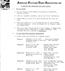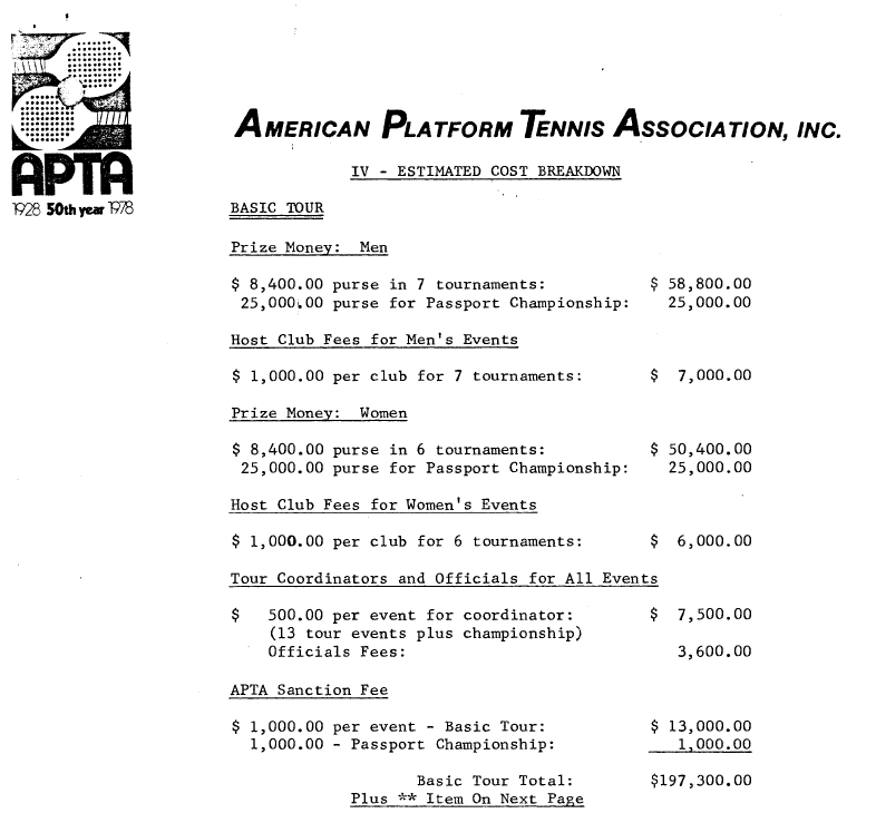 A Grand-Prix tour of Men's and Women's APTA sanctioned tournaments leading up to a Grand Prix playoff Championship. Players would earn points at each tournament during the season to become eligible to play in the Grand- Prix event at season's end. Each tournament would have a purse with a larger purse to be apportioned at the Grand-Prix Championship. A "leader-board" would be posted at each tournament to show the current standings of the competing teams.