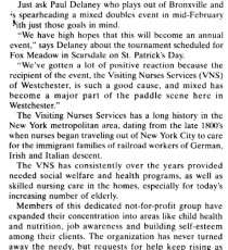 Paul Delaney, who played out of Bronxville, arranged a mixed tournament to support the Visiting Nurses Services of Westchester and received lots of positive reaction because of the good cause and the popularity of mixed events in Westchester. He hoped to make this an annual event, and it still is.