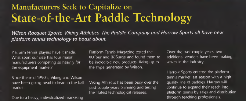 In April of 1999, Kjeldsen bought out Wilson's ball market share for an undisclosed figure and term limit. Since then, Wilson's former promotional Director John Embree began to focus on the paddle market, particularly in the Midwest and amongst women. Two years ago, Jim Burda replaced Embree to direct the platform tennis program. His duties included detailing paddle specification, testing equipment and then marketing to players and instructors across the northeastern states.