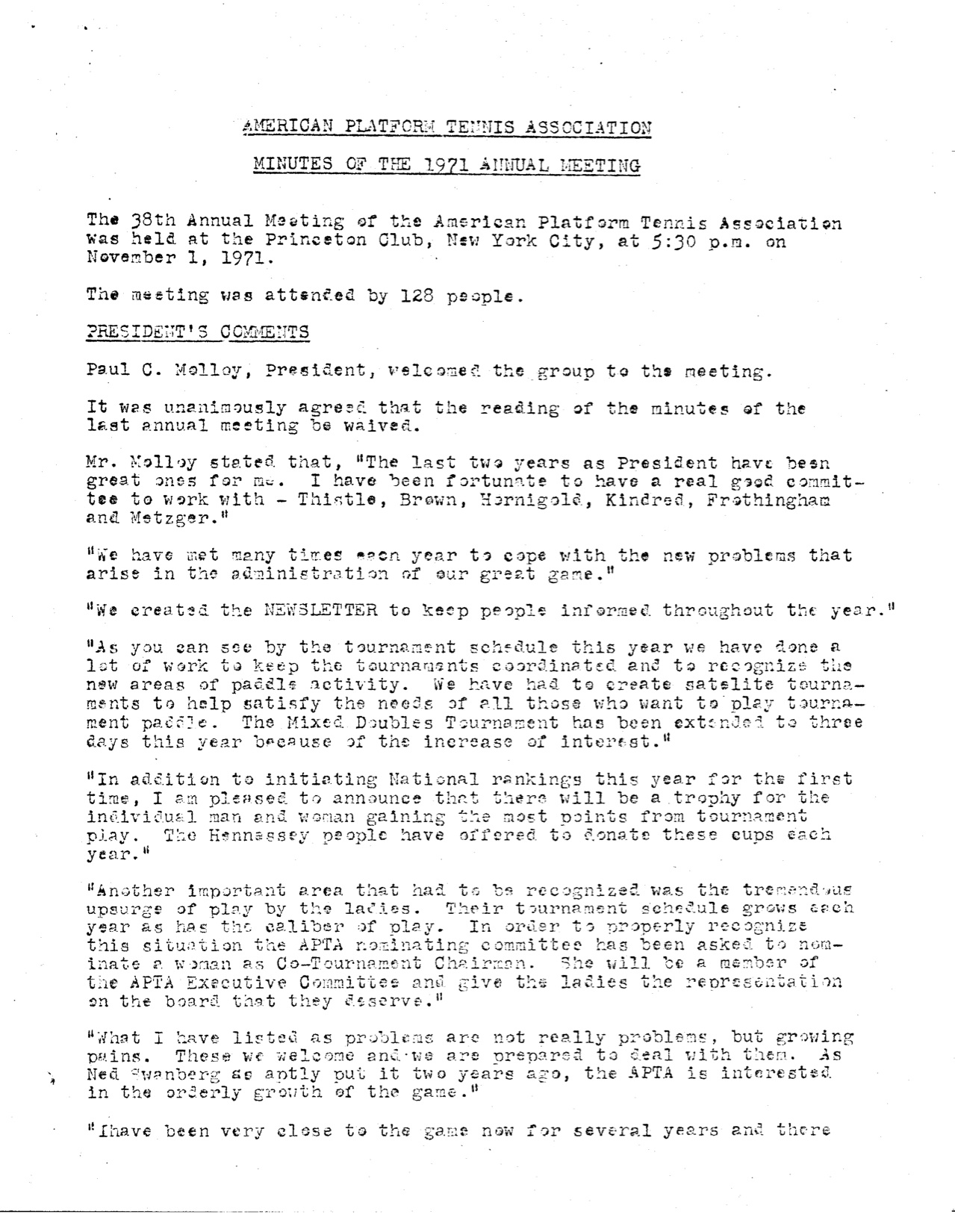 The Minutes of the meeting also included comments by outgoing APTA President Paul Molloy on the progress made over the past two years of his term, the financial statements, tournament results, Men's and Women's Rankings and a brief report of developments with the ball.