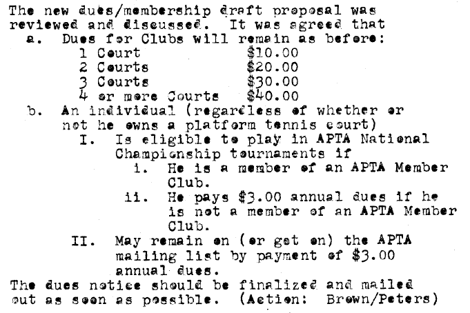 “The APTA will have a new dues policy this year, notice of which has been sent out. Briefly, any individual who is a member of a dues paying club in the Association is eligible to play in any APTA Tournament. However, in order to be on the mailing list, he must pay annual dues of $3.00. Any individual who is not a member of a member club becomes a member of the Association upon payment of the $3.00 dues and can play in any APTA Tournament and will be put on the mailing list. (Obviously, one $3.00 payment is sufficient to cover the family).”