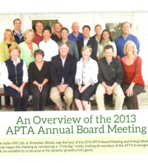 Hellos and Goodbyes The board welcomed four new members and said farewell to three whose terms expired. The APTA membership elected in David Lee, Region II, Shannon Vinson, Region V, Nathan LeFevre, Region VI, and Freddy Goldenberg, Region VII. Juan Martinez-Arraya, Tina Kelly, and Peter Lauer will be missed. Arraya brought great energy and dedication to the Clinics and Exhibitions Committee. Kelly's savvy marketing, writing and editing skills were invaluable for all APTA communications. And Lauer, head farmer for six years of the Grow the Game initiative, boosted a good program into a great program.