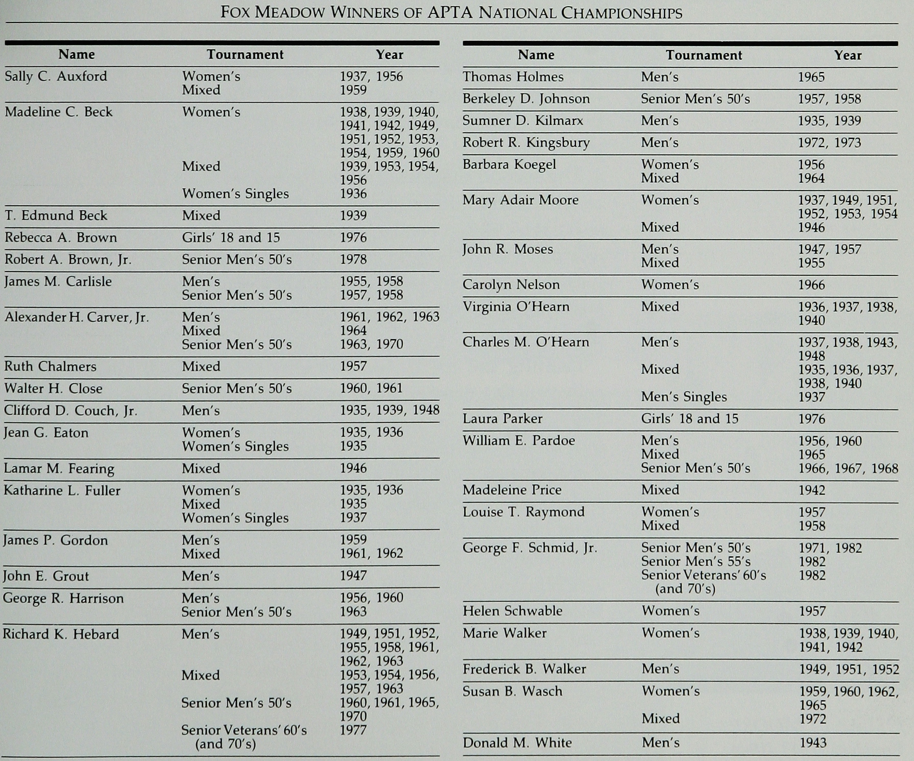 In Denver, the “Mile High” city, platform tennis had found a new frontier and was slowly but steadily increasing in popularity. In addition to courts at two clubs and several private courts, more were being planned at a third. All of these facilities were within fifteen minutes of each other, making future tournaments more feasible. Sally Burbank of Englewood, Colorado, had given much of her time to teaching and promoting platform tennis, free of charge.