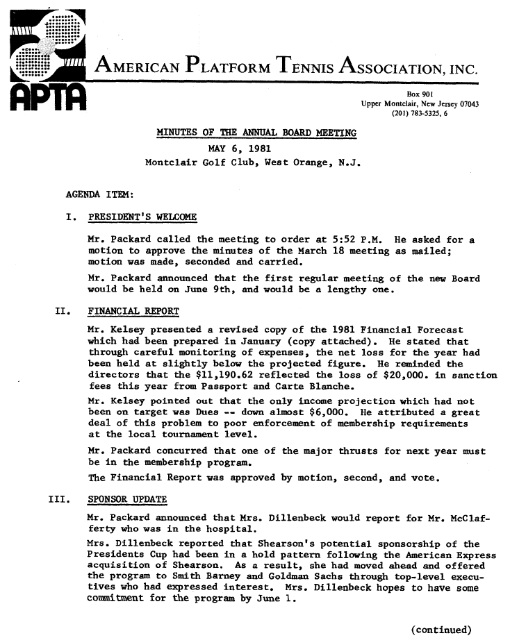 Of the more than 2,500 copies of the newsletter mailed to the membership, seven were returned to the APTA Office: five in favor of lengthening the service box, and two opposed. Based on such an underwhelming response to the proposal, the Board determined that there was not enough interest to warrant further [...]