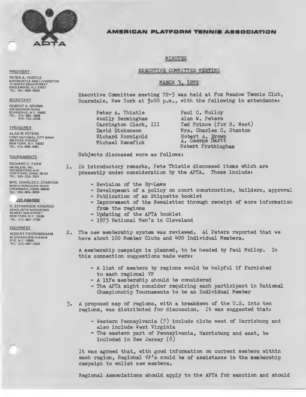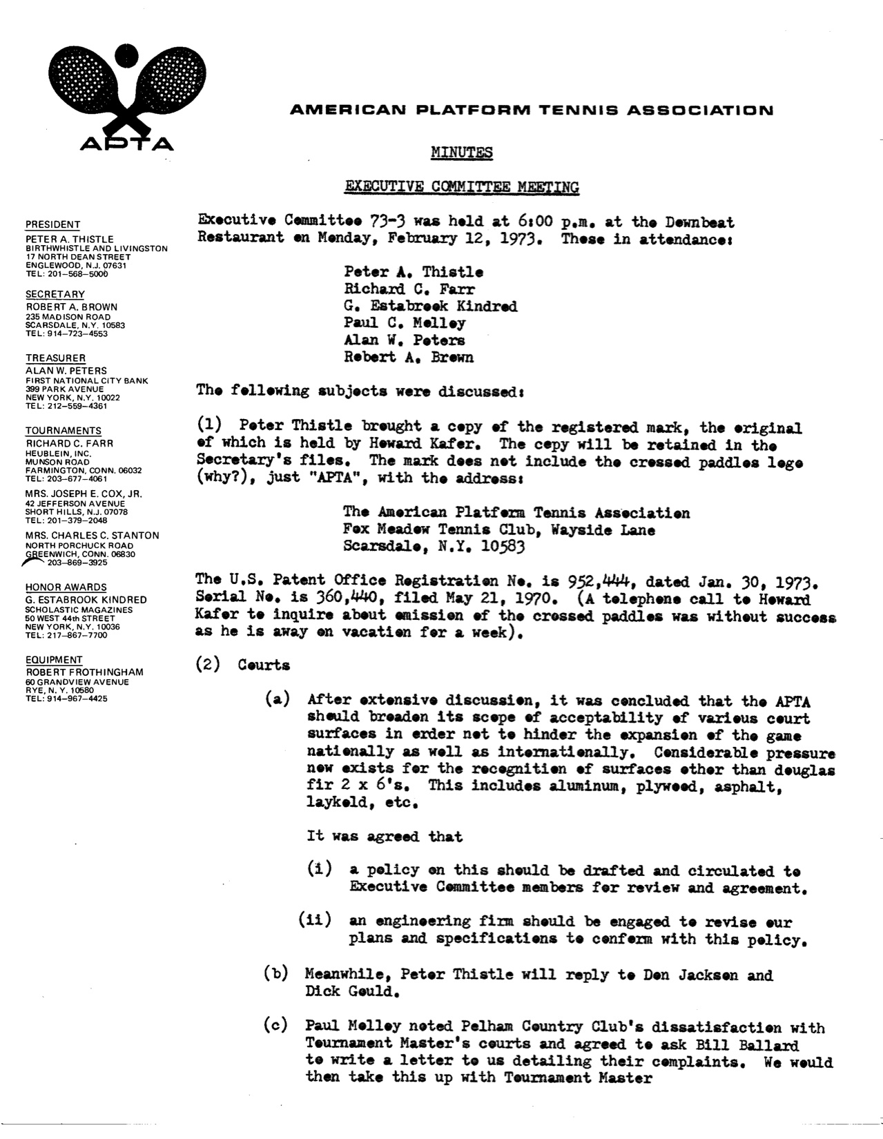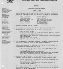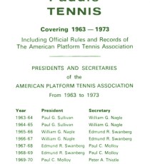 “As you can see, with this issue of the Newsletter there are a number of changes -- new title, new format, and, since the Annual Meeting, some new people on the APTA Board. The Board has been expanded to 13 Directors, and we are pleased to have wide geographic representation. Four of the Directors are from regions other than the New York Metropolitan area -- and we have a good balance of experienced and ‘new blood’. The Newsletter is our main communications medium with the membership. We're trying, under the guidance of our new editor Bill Ballard, to make it informative and interesting and to keep you posted on what's going on in the world of platform tennis.”