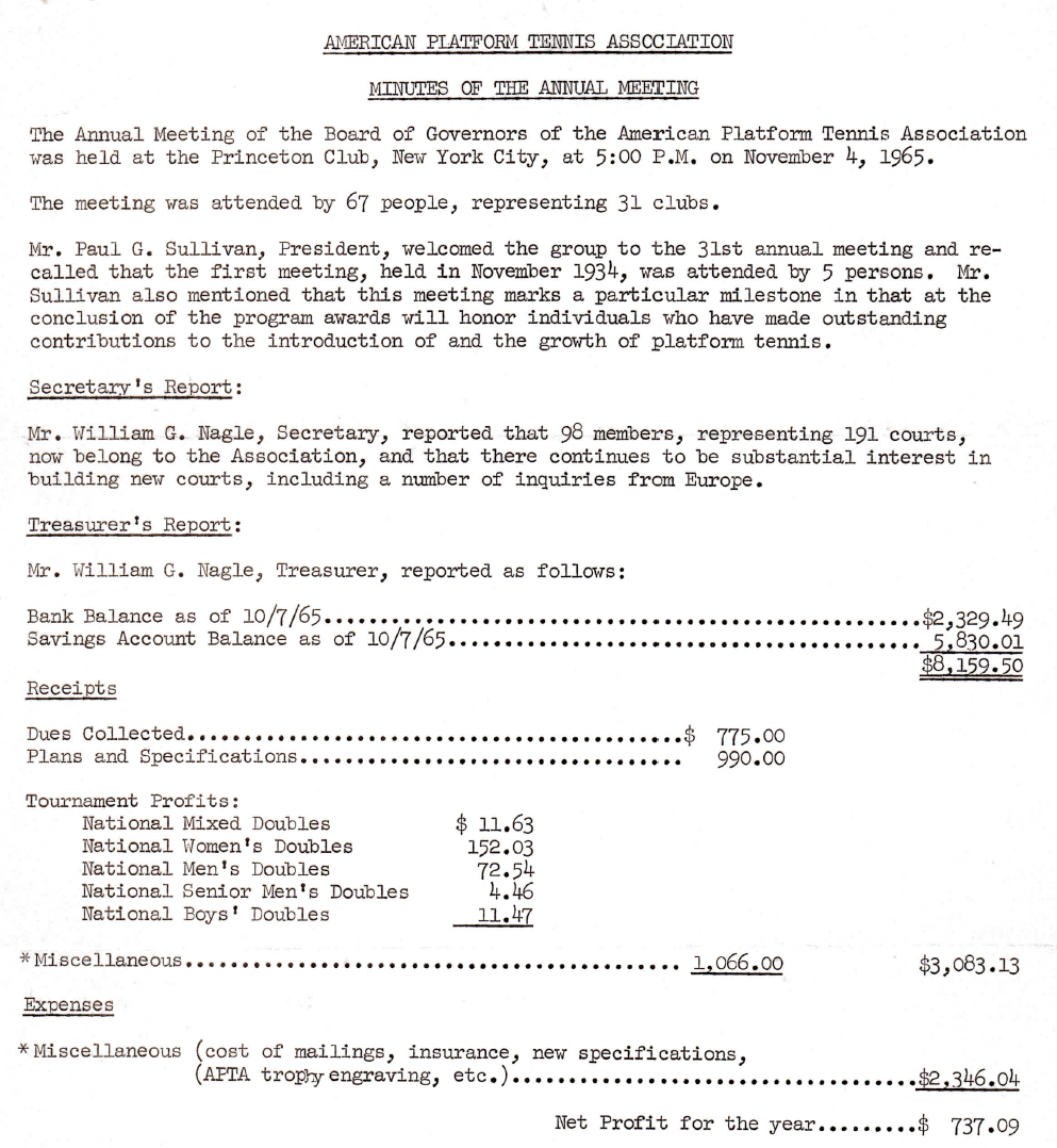 On February 18, 1965, the APTA gave out the inaugural Honor Awards to individuals who had made outstanding contributions to platform tennis. The awards were to be presented when the association's Executive Committee felt that one or more individuals merited inclusion in the group of men and women who had created the game, nurtured it, or played it as champions.