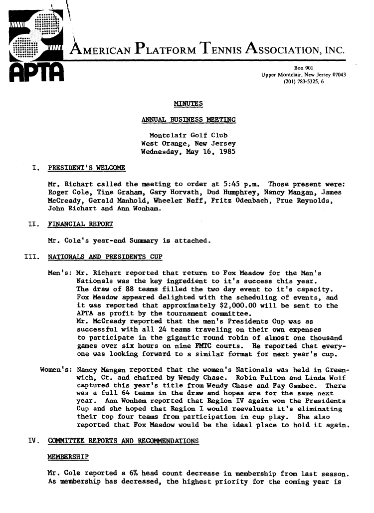 Read MoreDon was the APTA President from 1942-1944. He began playing paddle in the early 1930s, and became a National Champion in 1943 with Charles O'Hearn as his partner. He was friendly with Blanchard and Cogswell and often contributed to the direction in which the game has evolved. Don was a member of Innis Arden Golf Club in Old Greenwich, CT, and an enthusiastic promoter of the game to the membership. The Innis Arden Mixed Invitational Tournament trophy is dedicated to him. Source: Platform Tennis News, Spring 1987