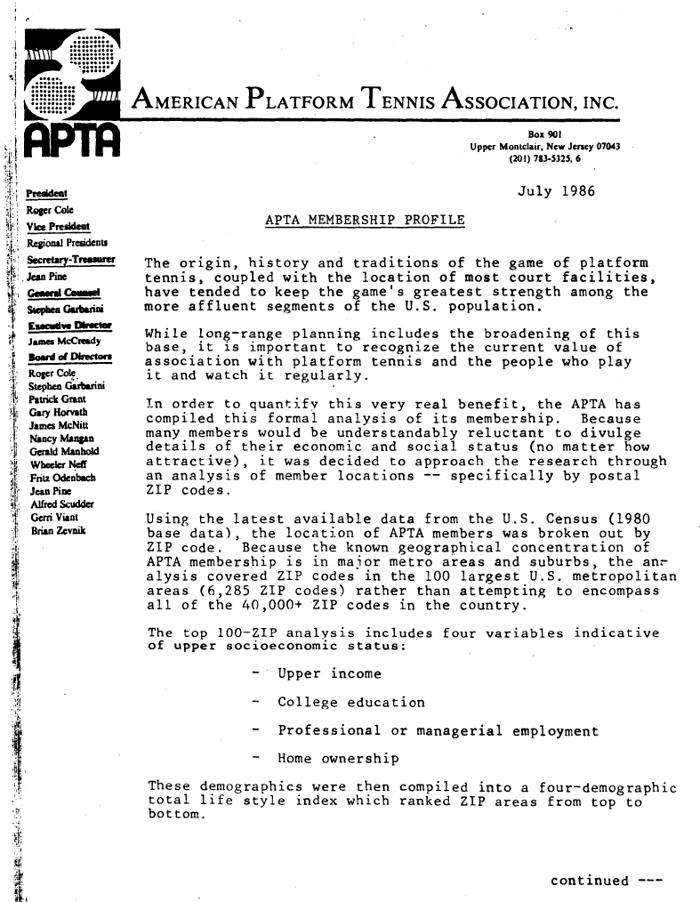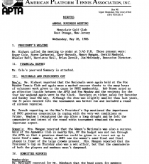 The men’s and women’s National Championships culminated at the Fox Meadow Tennis Club in Scarsdale, NY, and crowned new champions in both divisions. Sunny skies and warm temperatures drew large weekend crowds and spurred on competitors. The women's tourney produced the popular team of Pat Butterfield and Diane Tucker as champions. In the men’s draw, the new and legitimate team of Hank Irvine and Greg Moore soundly and artistically beat the defending champions Baird and Maier. Over six hundred spectators shared the surprise as Moore and Irvine stayed even, and then won the big points for the first set. Behind 1-3 in the second, they flicked the switch and won eleven of twelve games to storm onto the popular straight set victory 6-3, 6-3, 6-1. Source: Platform Tennis News, April 1986 Greg Moore in action in the final of the Men’s Nationals at Fox Meadow Tennis Clu[...]