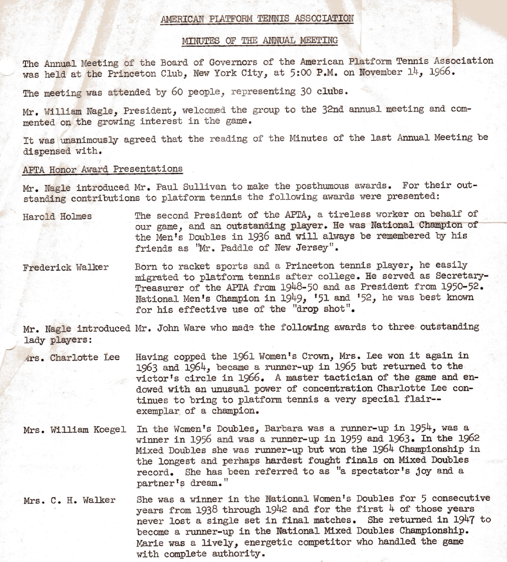 Malloy had been very close to the game for many years but, despite this, in his farewell remarks as President, he said, “….there is no way I can picture where our game will be 10 years from now. The instant appeal of the game is so great that it is impossible to estimate how long the accelerated growth will last and how far it will spread." Under his leadership the first newsletter was created to keep players informed of activities throughout the year and much work was done in scheduling and coordinating tournaments and satellite events in recognition of the new areas of growth in the game and their demand for tournament paddle. National rankings had also been established by the end of his term, with Hennessey donating cups to the individual man and woman gaining the most points from ranking tournament play. With the upsurge in women’s play, he was also instrumental in getting[...]