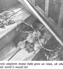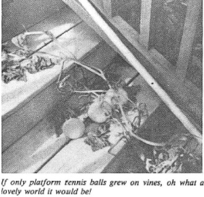 We will be following up on them with the hope that it will be fruitful in bringing us an improved product for our game. Speaking of the "ball," I recently delivered a supply to the captain of one our women's teams. As I was descending the steps at the rear of her house, I could not believe my eyes. There growing in the garden were "Platform Tennis Balls." Closer inspection, however, showed them to be yellow gourds. Unfortunately, this picture in black and white is not as striking as the color original, but you can visualize it. When I mentioned this finding and put up the picture on our warm-up hut bulletin board, I was told that it was a great idea to grow the balls, except t[...]
