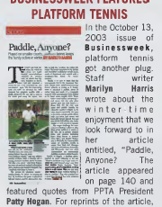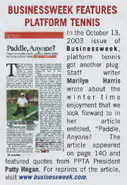 In the October 13, 2003 issue of Business Week, platform tennis got another plug. Staff writer Marilyn Harris wrote about the wintertime enjoyment that we look forward to in her article entitled, "Paddle, Anyone?"