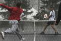 Photograph: Brian Uihlein hits a forehand drive during a snowy match at the 2008 Nationals in Rochester. Mike Cochrane is at net.