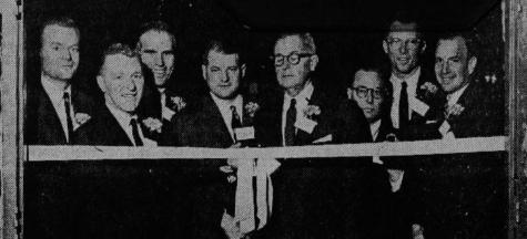 Description: Fox Meadow President Ollie Kingsbury wields the scissors as the new wing is formally opened. Watching are Governors Wilson, Sullivan, Ware, Nagle, Hammer, Tredwell and Close