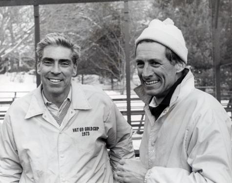 Photograph: A jubilant moment for John Mangan and Gordon Gray (seeded 8) after upsetting Chip and Steve Baird (seeded 3) in the quarter-final round of the Men's Nationals at Fox Meadow Tennis Club, Scarsdale, NY