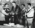 Photograph: The awards presentation at the 1956 Men’s Nationals (from left): Bill Pardoe, George Harrison, Ted Cook (APTA president and tournament chair), Don McNeill, and Herman Schaefer