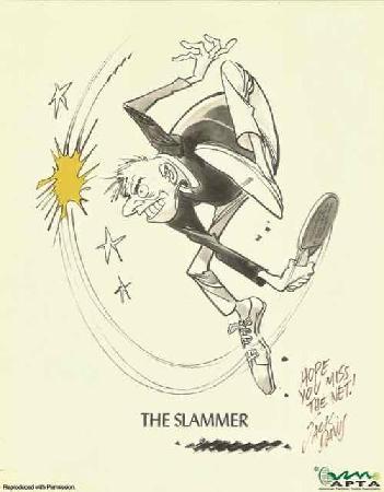 Description: One of the classic "Paddle Tennis" cartoons created by noted cartoonist Jack Davis during the 1970s. Davis was a member of Scarsdale Golf Club when these were done. He often used Fox Meadow member Karen Reuter to do any coloring required for his cartoon.,Jack Davis (1924-) is an American cartoonist and illustrator, known for his advertising art, magazine covers, film posters, record album art and numerous comic book stories. He was one of the founding cartoonists for Mad in 1952.