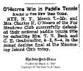 Newspaper Article: "O'Hearns Win in Paddle Tennis" NYT article of results of 1937 Mixed Nationals at Manursing Island Club