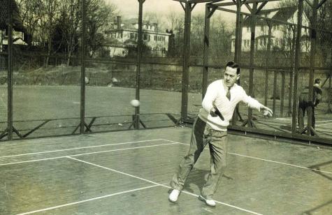 Photograph: A 1937 publicity photograph featuring Charles O'Hearn playing singles. Only two men have won both the Singles and Doubles in the same year - O'Hearn(1937) and Bob Kleinert (1984)